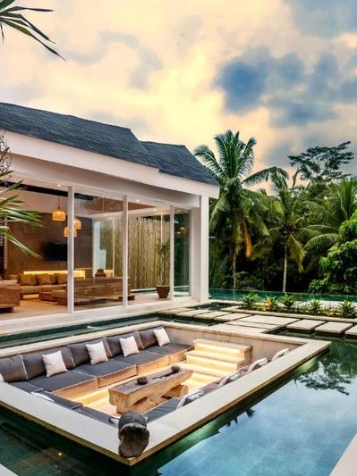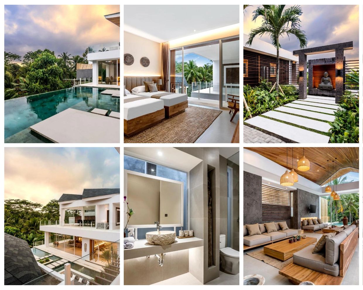 Our private Villa (pictured), located in a remote area with rice field and jungle views, encapsulates the beauty of Ubud without any effort needed. Every part of our 2-storey, 6-bedroom (each with its very own ensuite), fully equipped villa is luxurious in every sense, starting from its very own sunken seating area in one part of the pool, to the unforgettable views from every angle.